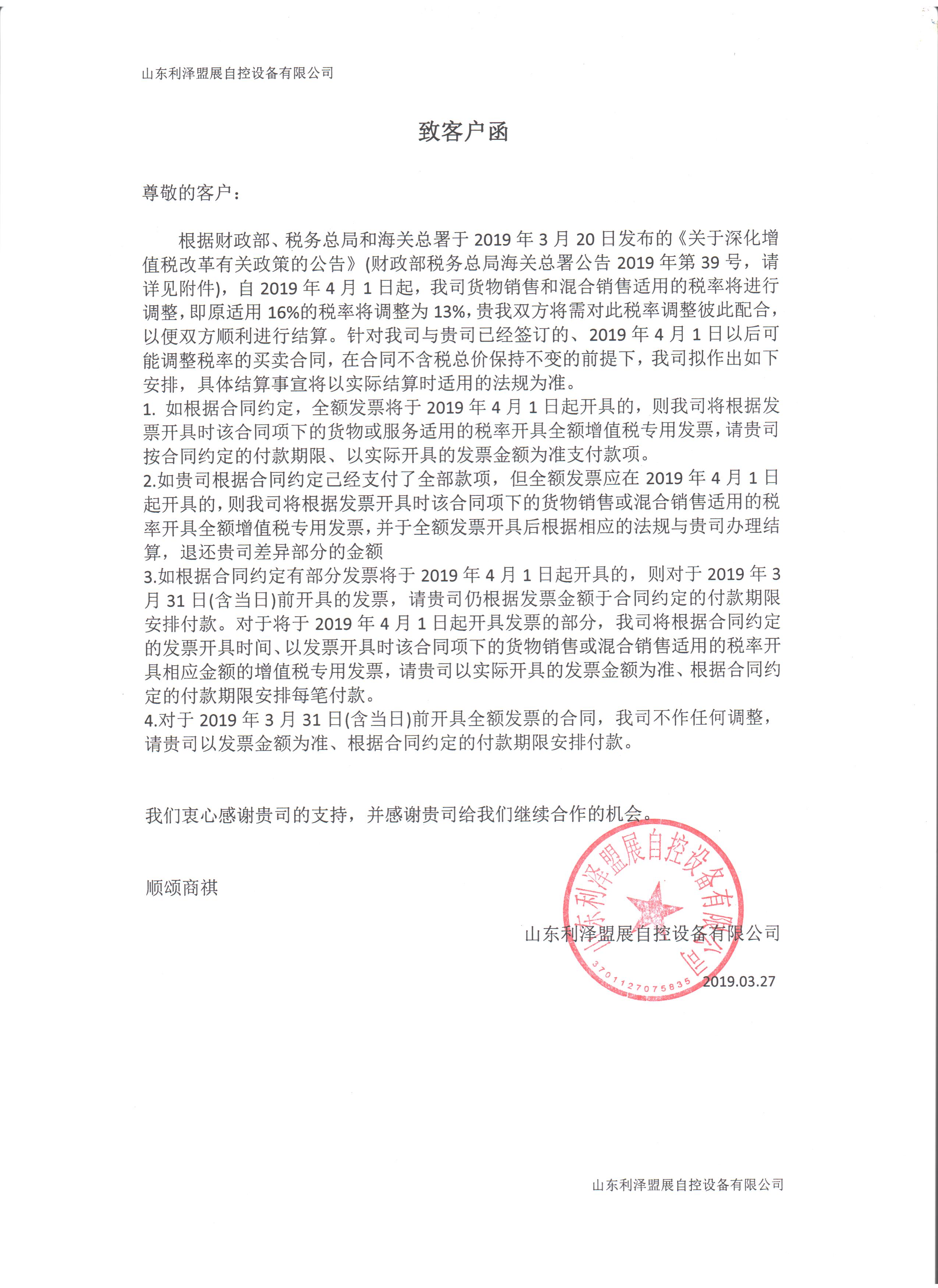 山東利澤盟展自控設(shè)備有限公司2019因稅率下調(diào)致客戶函