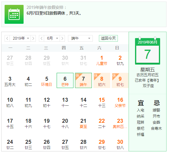 端午節(jié)假期將至,首先向全體員工致以節(jié)日的問候,為了度過歡樂、祥和、平安的節(jié)日,2019年端午節(jié)的放假時(shí)間:2019年6月7日至6月9日放假公休,共3天。6月7日(星期五,農(nóng)歷端午節(jié)當(dāng)日)為國家法定節(jié)假日,6月8日(星期六)公休,6月9日(星期日)補(bǔ)休。